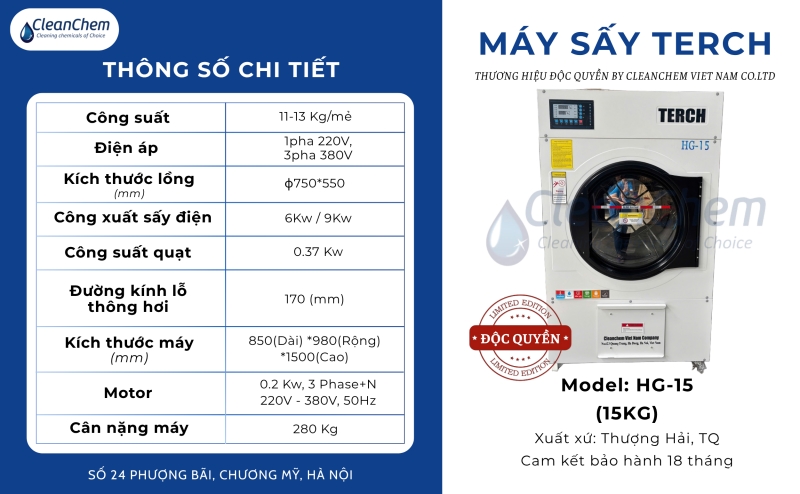 - Máy sấy công nghiệp (Tumble Dryer): Thiết bị quyết định tốc độ trả hàng cho khách. Máy sấy cần có lồng sấy lớn và khả năng gia nhiệt nhanh để làm khô và tơi xốp đồ vải. CleanChem phân phối các dòng máy sấy đồng bộ như HG-15 (15kg) và HG-100 (88-90kg) với công nghệ sấy đảo chiều chống xoắn vải, tiết kiệm năng lượng tối đa.