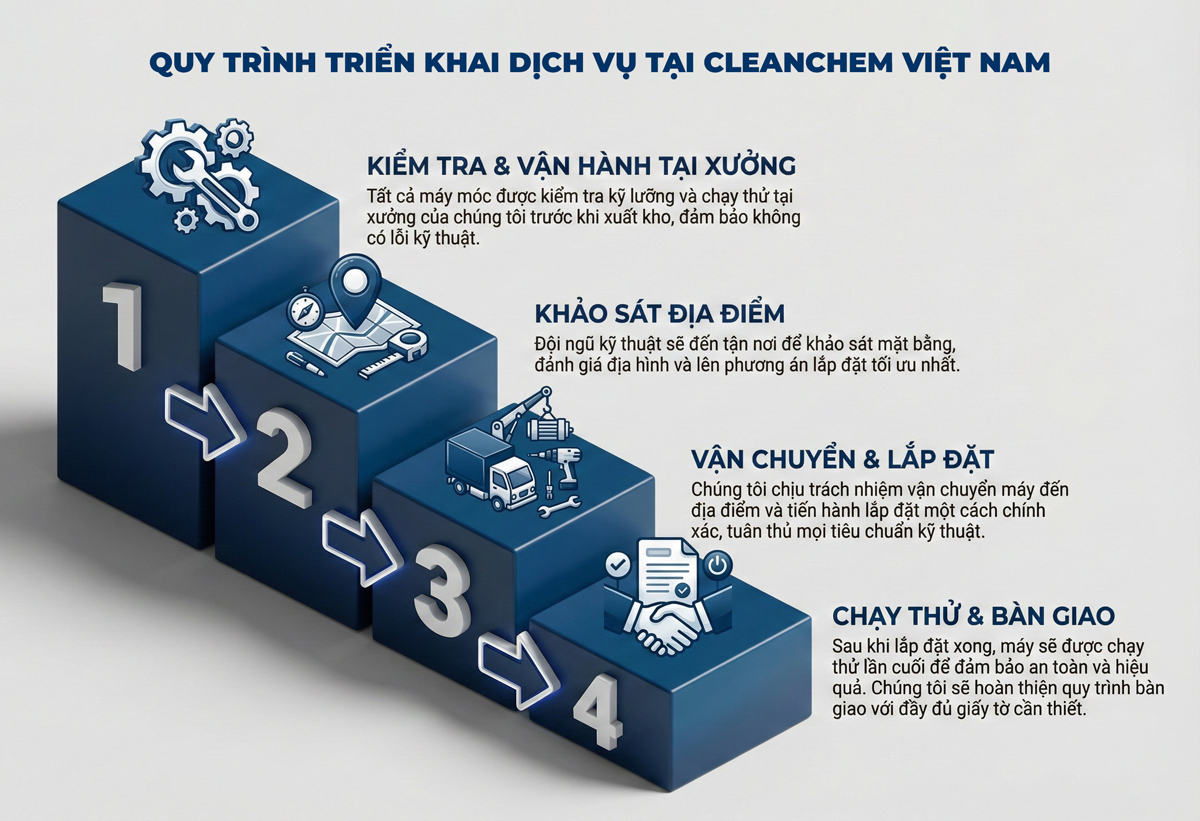 Với quy trình 4 bước khép kín và chặt chẽ này, CleanChem không chỉ bàn giao một chiếc máy giặt, mà bàn giao một giải pháp vận hành trơn tru, giúp khách hàng loại bỏ hoàn toàn rủi ro kỹ thuật và yên tâm tập trung vào kinh doanh ngay từ ngày đầu tiên.