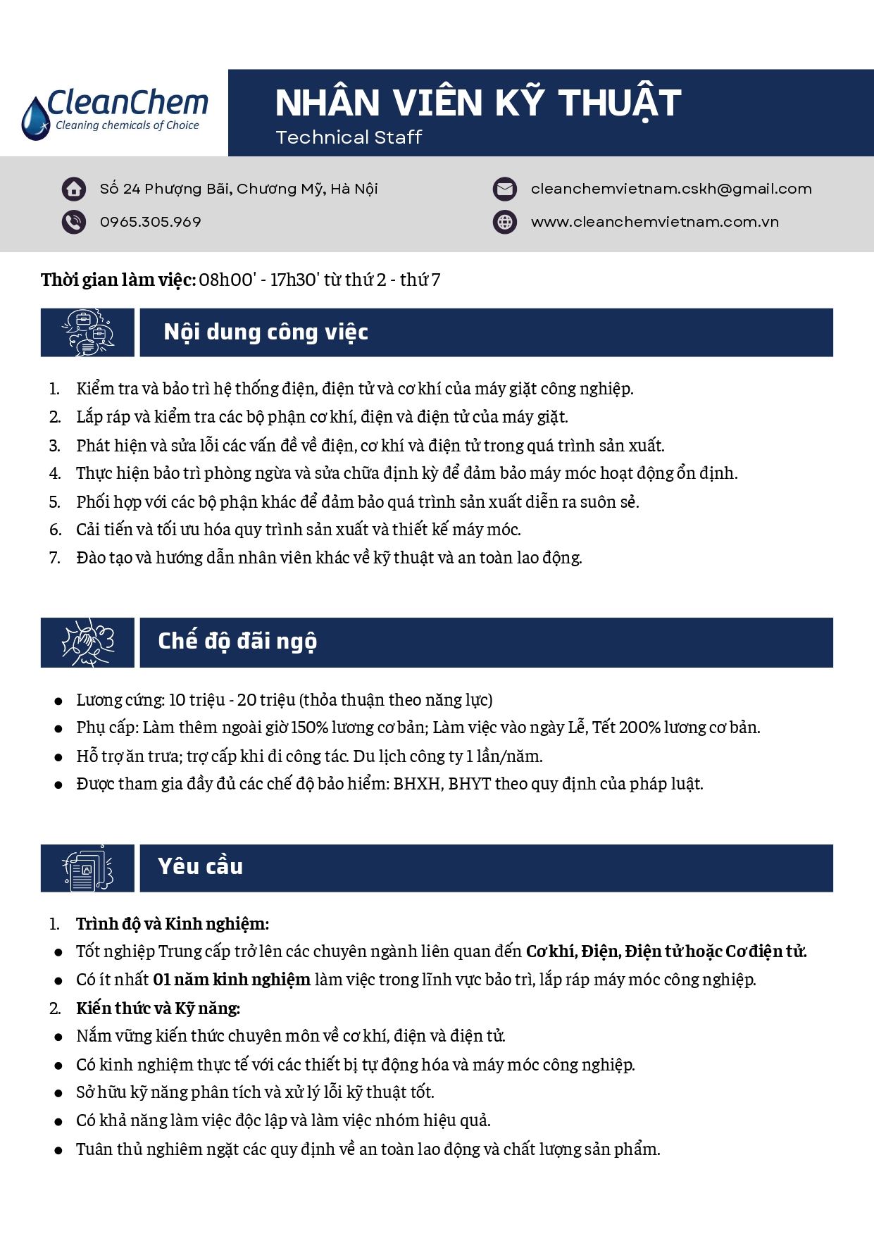 - Có ít nhất 1 năm kinh nghiệm làm việc trong lĩnh vực. Nắm vững kiến thức chuyên môn về cơ khí, điện và điện tử. Có khả năng phân tích và xử lý lỗi kỹ thuật tốt.